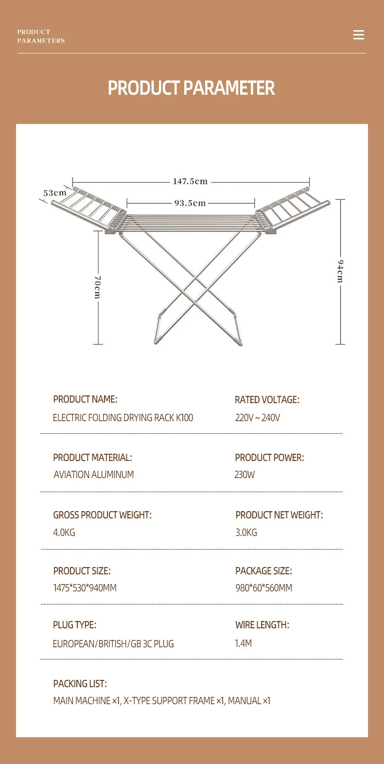 147.5 * 53cm Indoor Drying Clothes Rack, Floor Folding Electric Towel Dryer, Drying Baby Clothes, Heating Clothes Rack