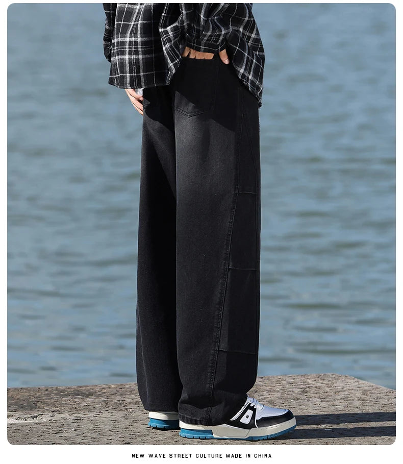 Jeans men's American high street vintage washed crease splicing men's spring and fall models loose straight pants